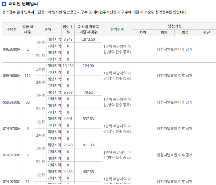 제가 일전에도 말씀드렸듯이, 46과 74는 워낙 분양하는 가구수가 적어 제외하고 경쟁률 예측했었습니다.