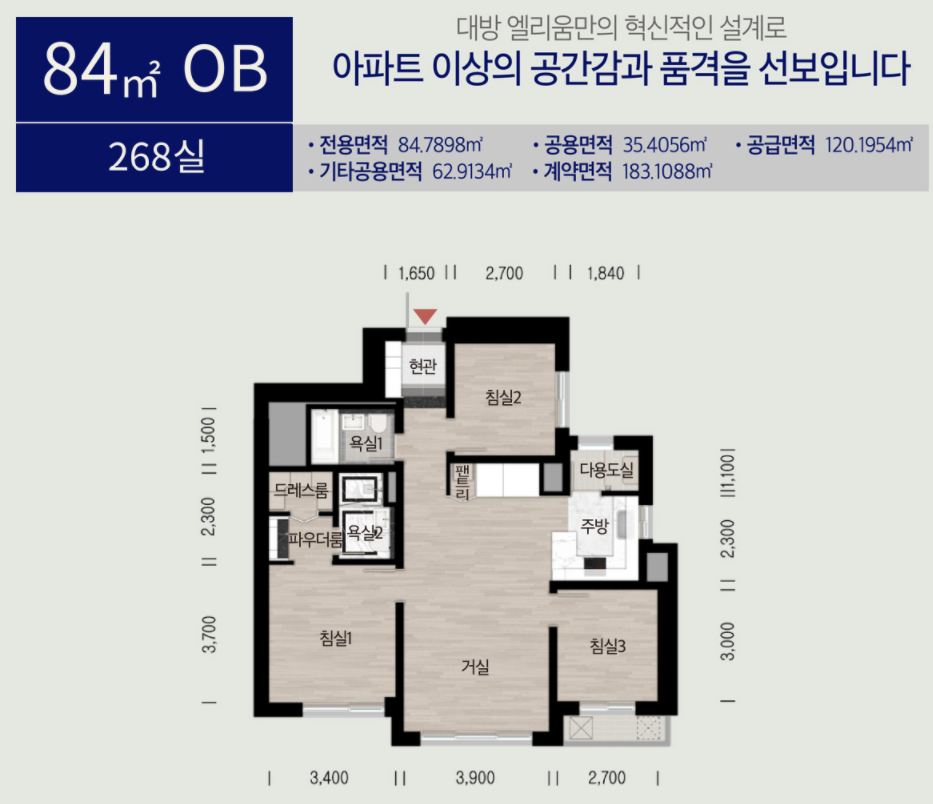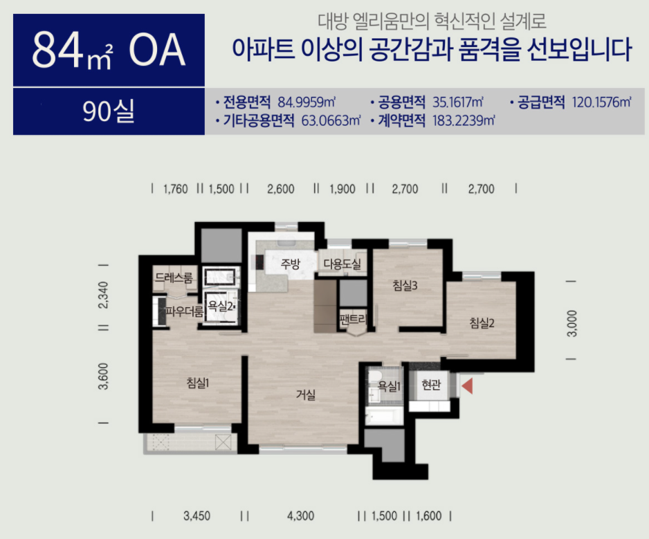 전체적인 평면도 구성은 84OA가 더 좋아보입니다. 주방과 거실이 일직선으로 구조가 되어있기 때문에 공기순환이 더 잘될것으로 보입니다.